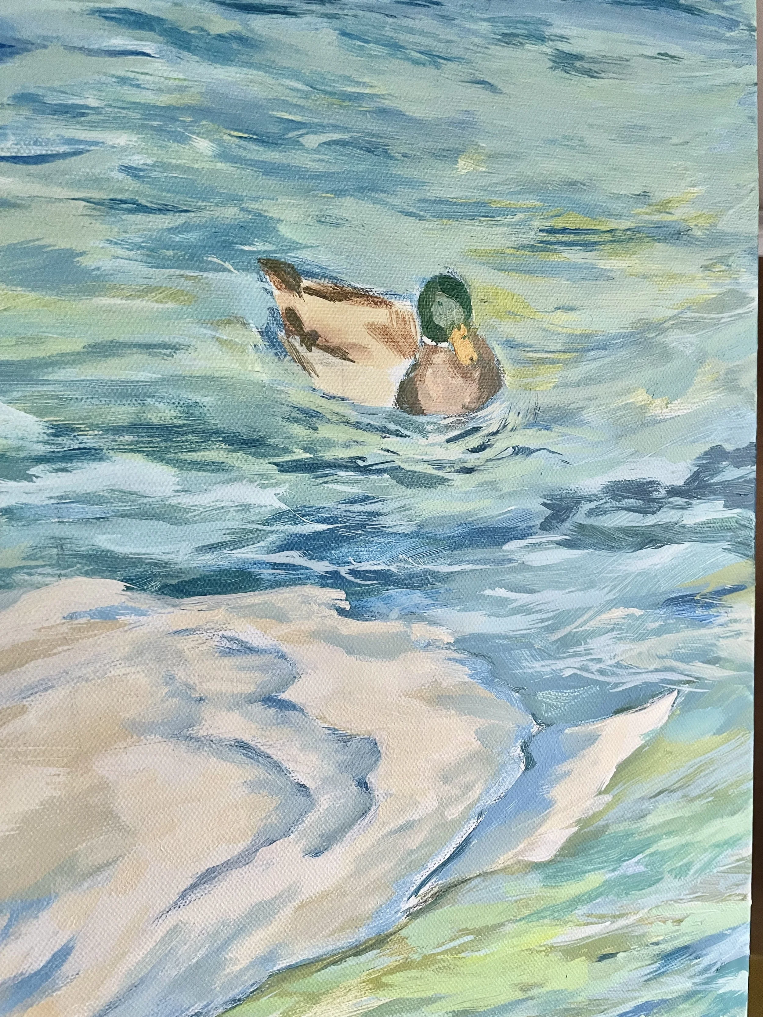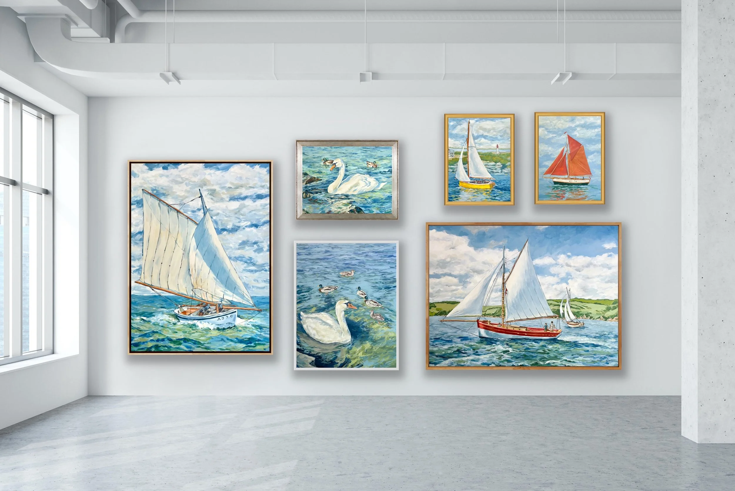 There is both tension and harmony found within each piece, In the sailboat images, there is the tension of man harnessing the elements, and of textured, windy seas/skies backdropped behind areas of triumphant calm in the billowing sails. In the swan images, tension exists between the dignified and the common, the majestic and the mundane, as well as the broken brushwork of the water and the solidified swan. Though tension exists, there is unity in the artworks also - harmonious color rendered throughout, and visible mark-making to convey motion, elegance, fluidity, soaring, vibrancy and life as we experience it.